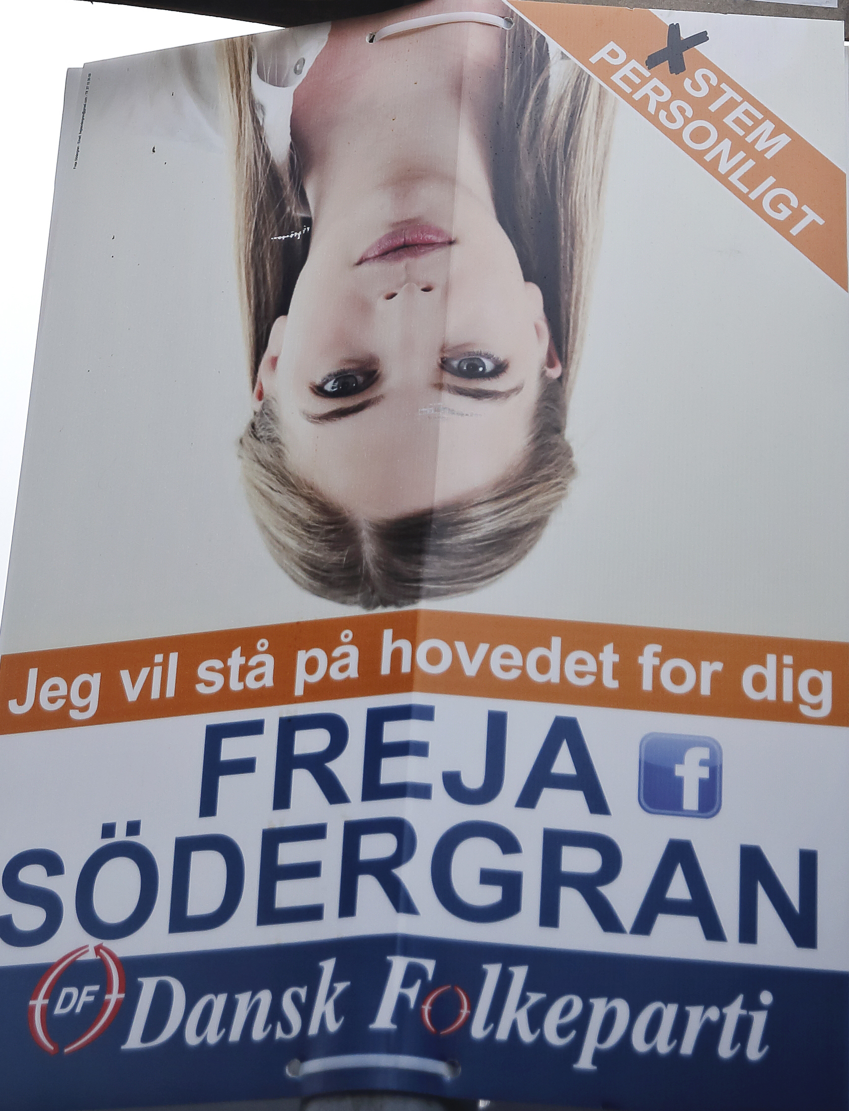 RASMUSMODSAT-EFFEKTEN: Tidligere formand for DF i Helsingør og medlem af hovedbestyrelsen Freja Södergren skilte sig ved seneste kommunalvalg ud ved at vende sit portræt på hovedet. Enkelt, men iøjnefaldende i en tæt skov af retvendte valgplakater. Hun blev ikke valgt til byrådet, hvor hun ellers havde afløst en partifælle et lille års tid. Til gengæld blev hun valgt til regionsrådet i hovedstaden.