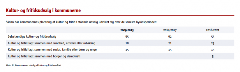 En opgørelse fra KL viser, at antallet af kommuner med et selvstændigt kultur- og fritidsudvalg er reduceret fra 65 i perioden 2010-2013 til 55 i indeværende periode 2018-2021. Udvalgene er mange steder lagt sammen med fagområder som sundhed, erhverv, beskæftigelse, social eller børn og unge.